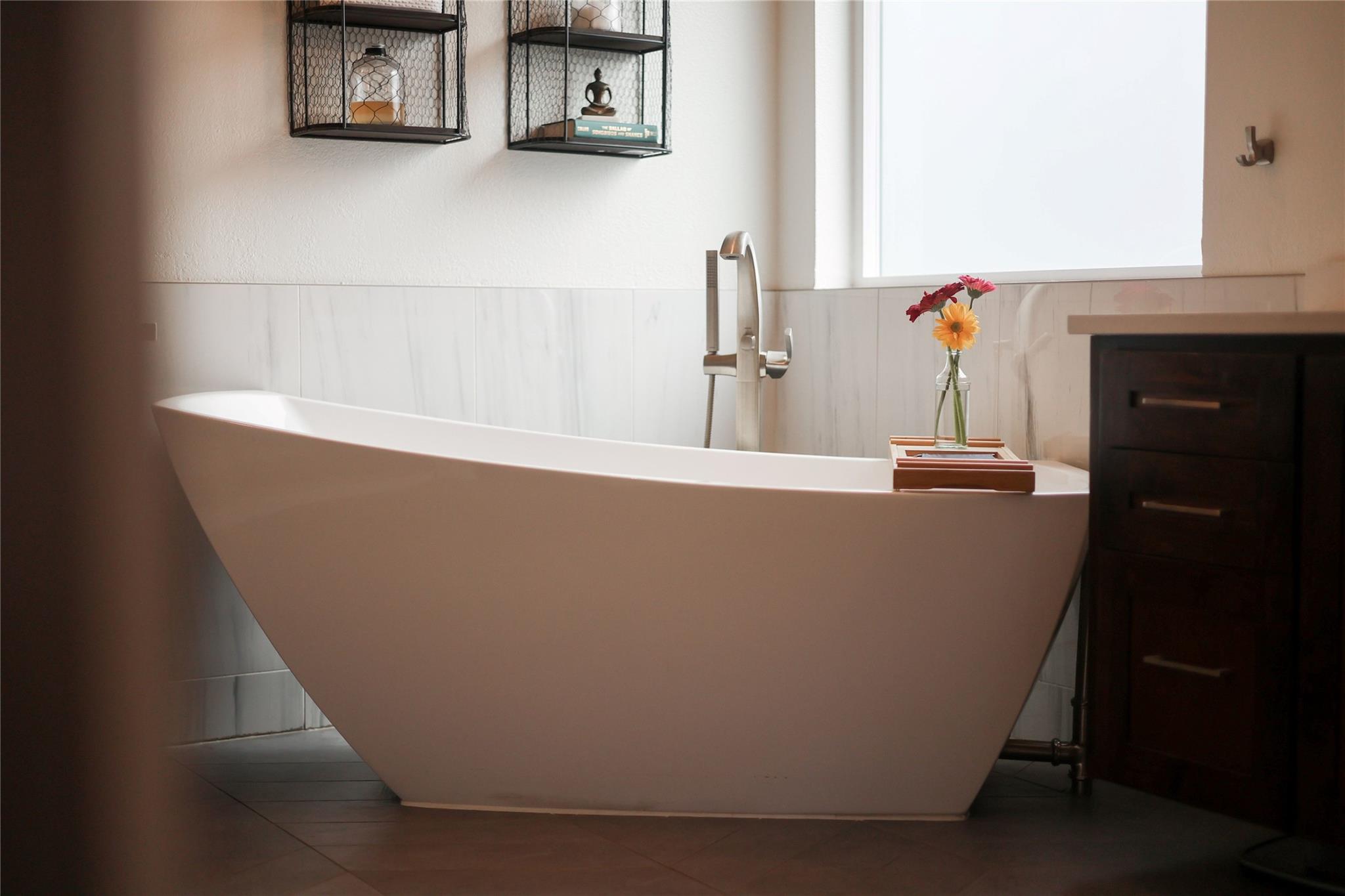 Inside, the home moves beyond original builder finishes into a more curated, custom-feeling space. A modernized kitchen with quartz countertops, updated sink and faucet, stylish backsplash, and painted cabinetry flows into open living areas. A spa-inspired primary suite--featuring high-end tile, a soaking tub, and a glass-enclosed rain shower--pairs with updated secondary bathrooms, upgraded baseboards, a redesigned fireplace, and iron stair railings for a cohesive, move-in-ready presentation.