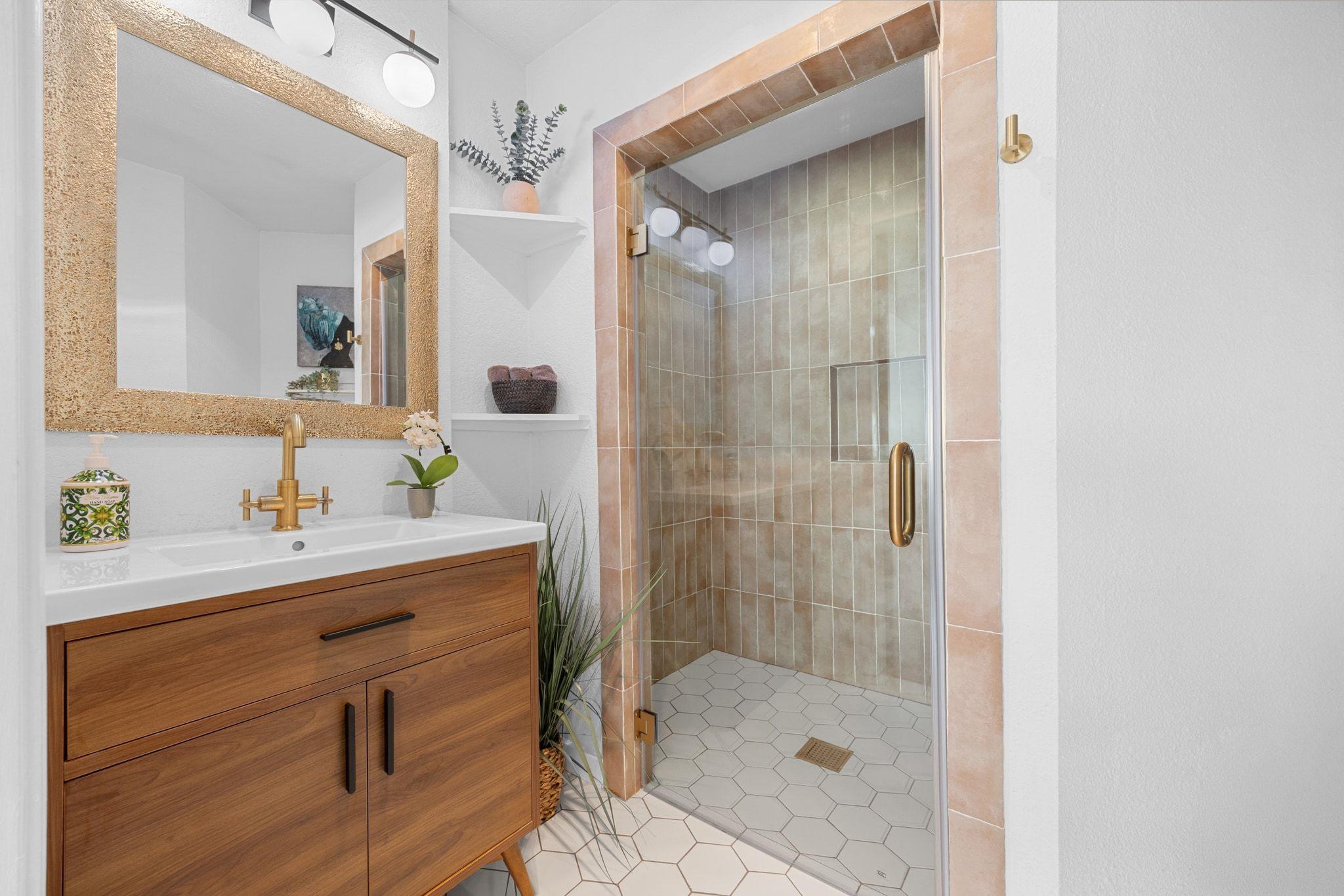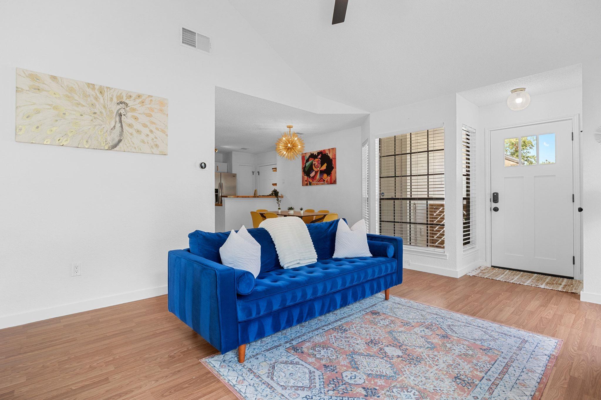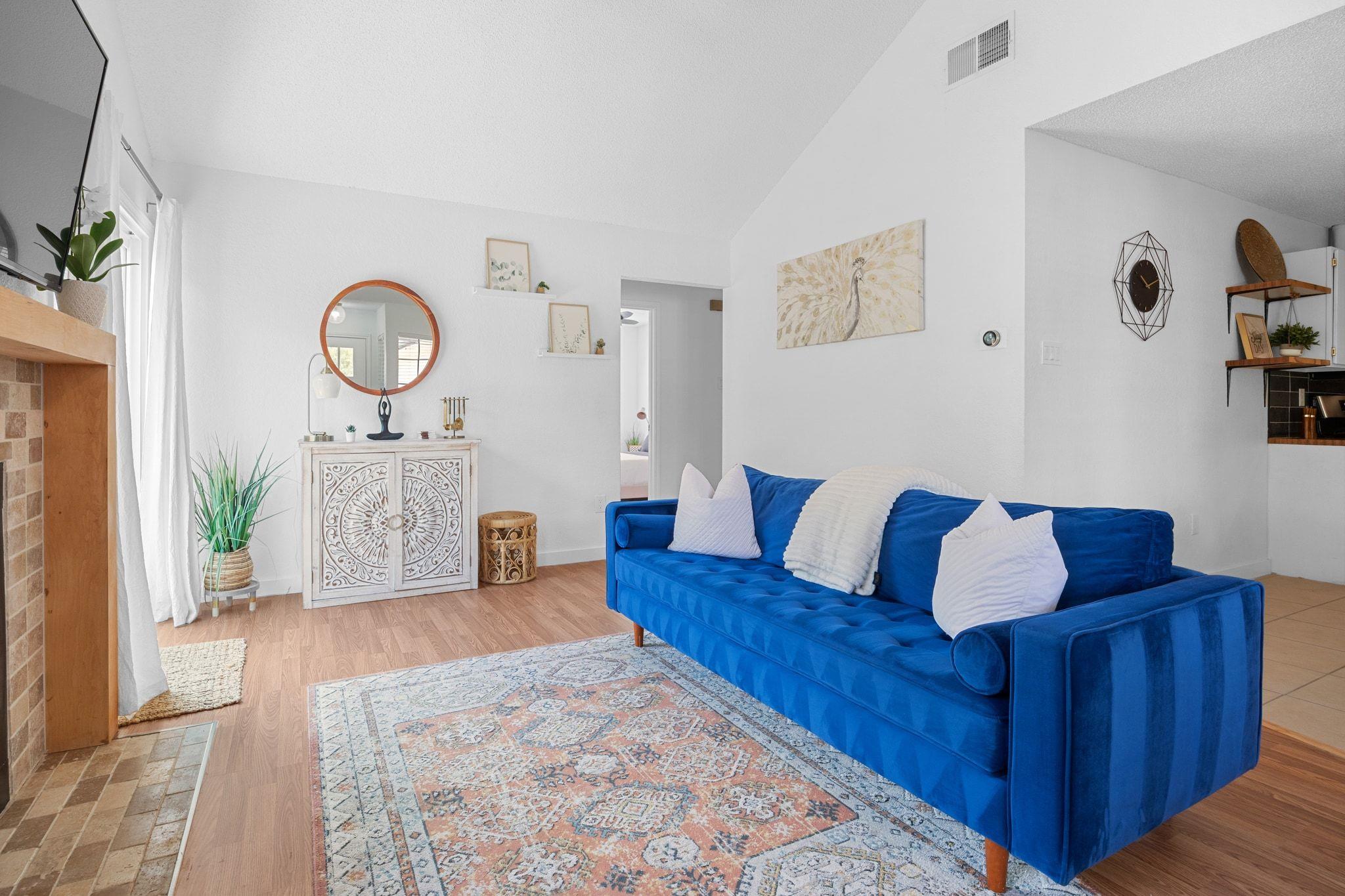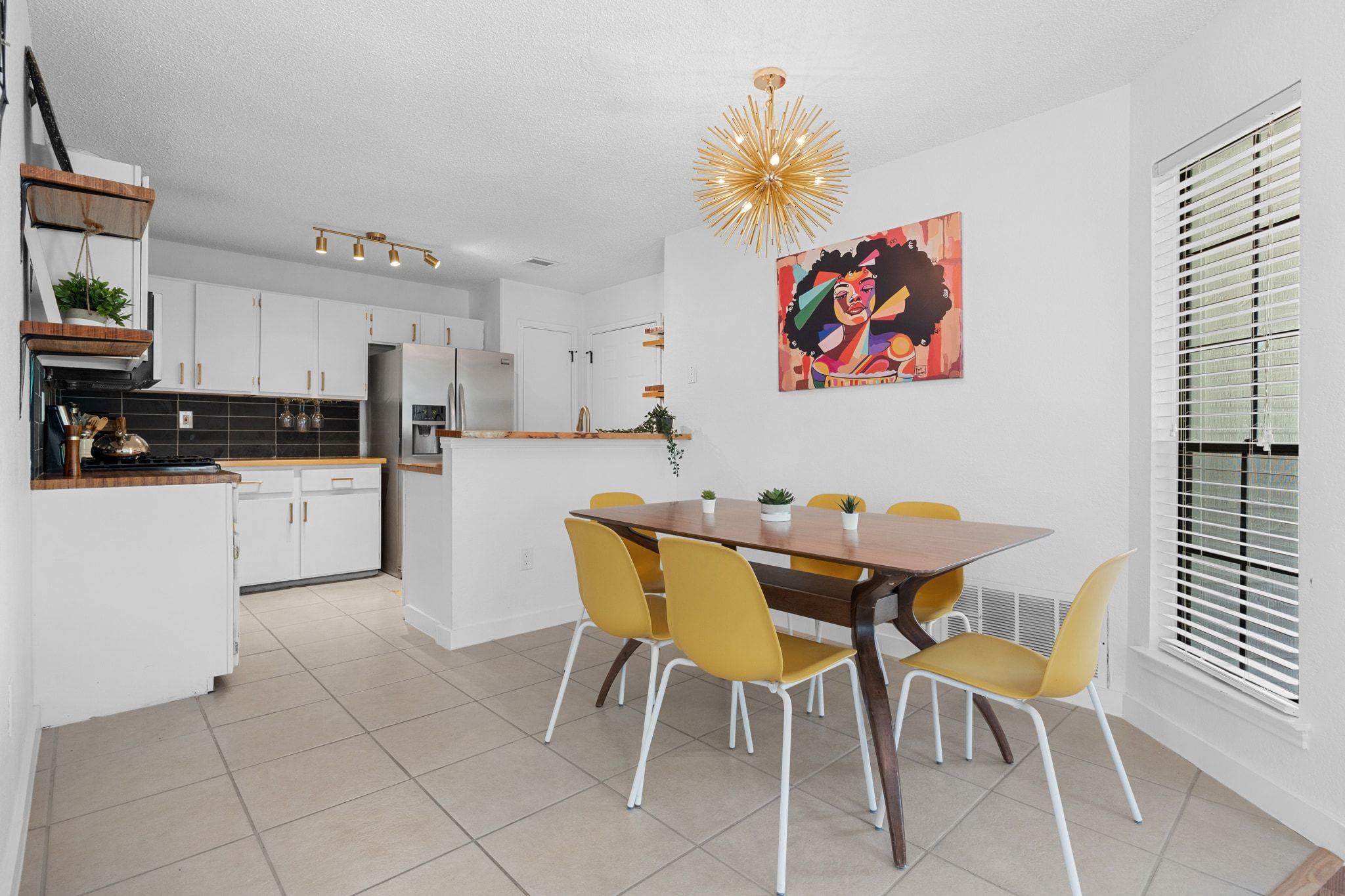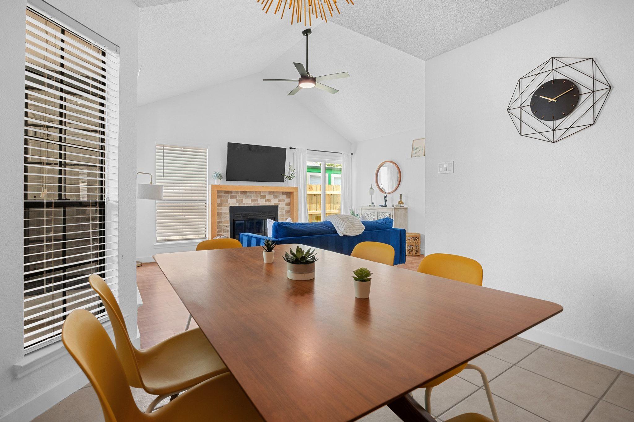 Step inside the airy living area, centered around a cozy fireplace, which seamlessly connects to the open-concept dining area and kitchen. Both bathrooms have been updated with elegant tile and fixtures. The smart thermostat and locks, along with a newer 2023 HVAC system, provide modern conveniences. The large, flat backyard is the perfect canvas for your outdoor dreams. This property is also short-term rental-ready, having been a successful Airbnb for several years, with furnishings available for negotiation.