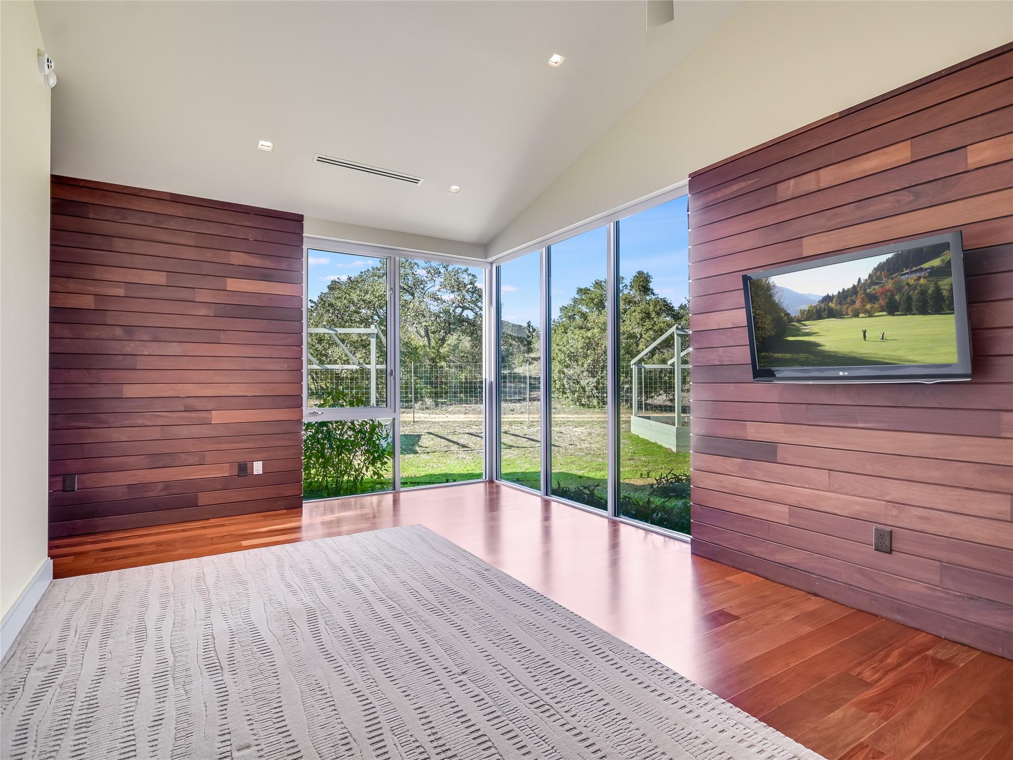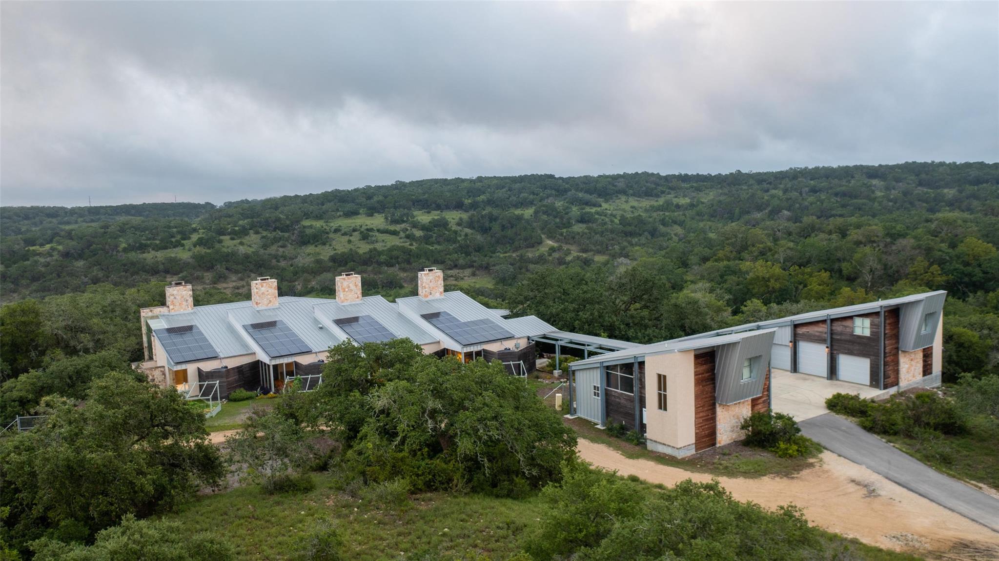 A once-in-a-lifetime opportunity awaits at Backbone Ridge Ranch, one of Wimberley's most iconic properties. This extraordinary nearly 50-acre estate harmoniously integrates luxury with nature, perched majestically atop a bluff overlooking the Texas Hill Country. The custom-built residence showcases a spectacular blend of limestone sourced directly from the estate's grounds, Ipe wood, and steel architecture that seamlessly embraces the landscape. Dramatic vistas, golden meadows, seasonal waterways, and breathtaking ridge lines create a private hillside paradise. The sustainable design incorporates 84 solar panels, 24,000-gallon rainwater storage, and tankless water systems aligned with LEED principles. Two separate three-car garages feature private apartments above, ideal for multi-generational living. Move-in ready and low maintenance, this versatile property delivers the complete package for discerning buyers seeking unparalleled scenic views, abundant wildlife, and nature on a grand scale.