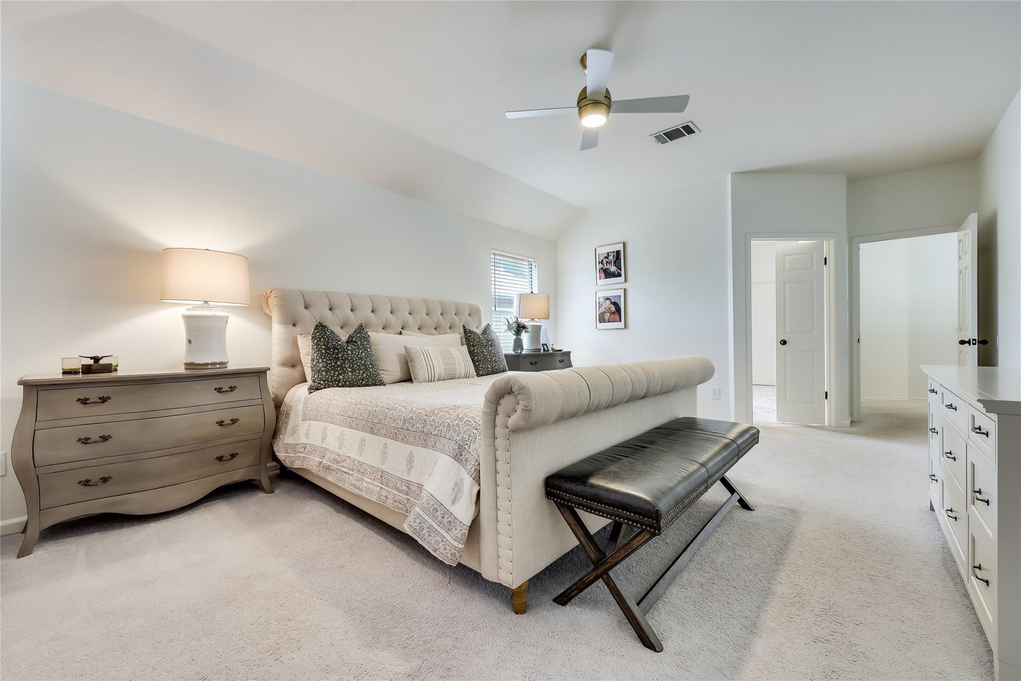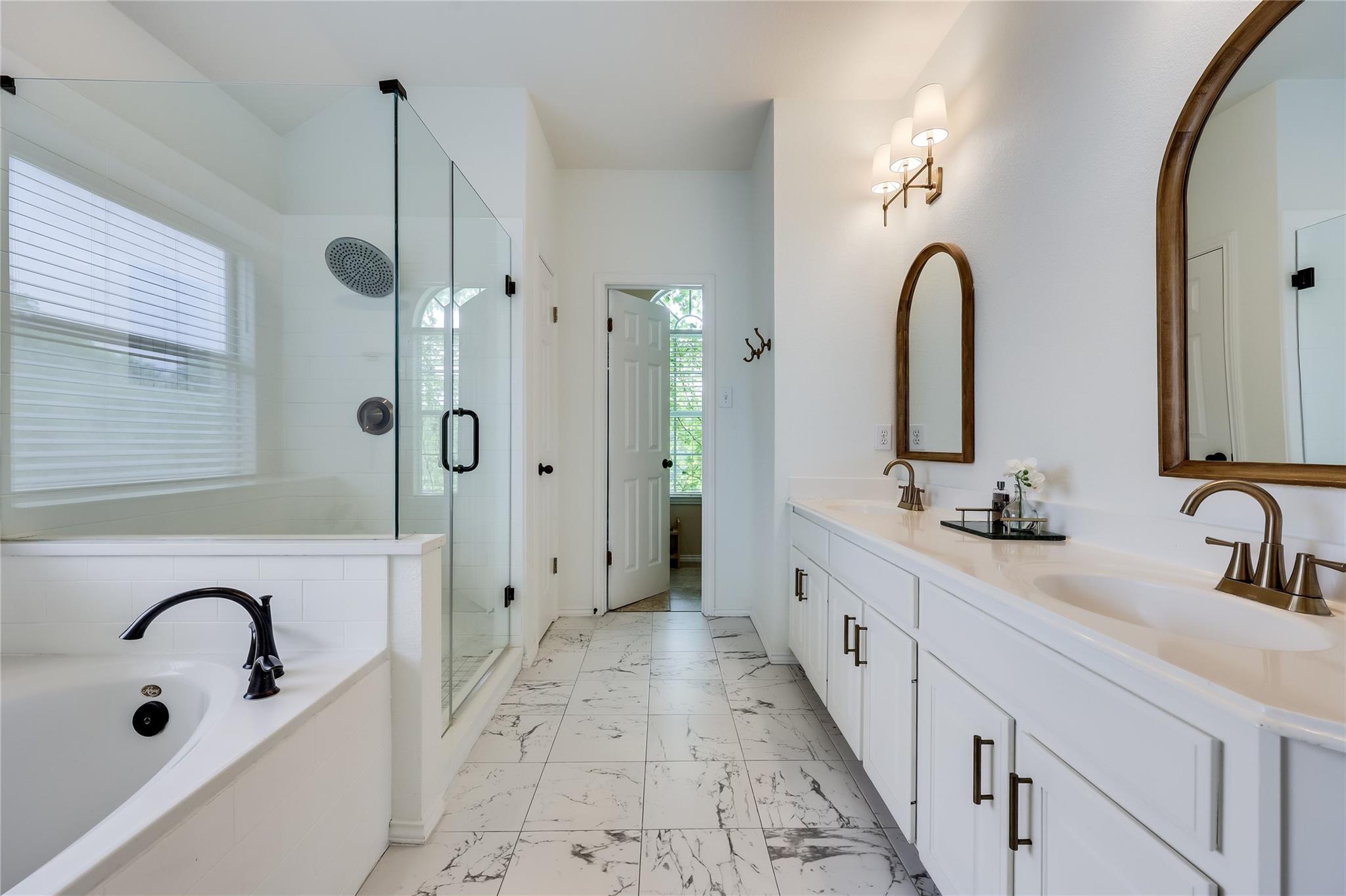 Upstairs, the primary suite is thoughtfully separated from two additional bedrooms, a full bathroom & a spacious game room, offering flexibility for today's lifestyles. The primary bathroom features a separate soaking tub, a walk-in shower, dual vanities, & a spacious walk-in closet.