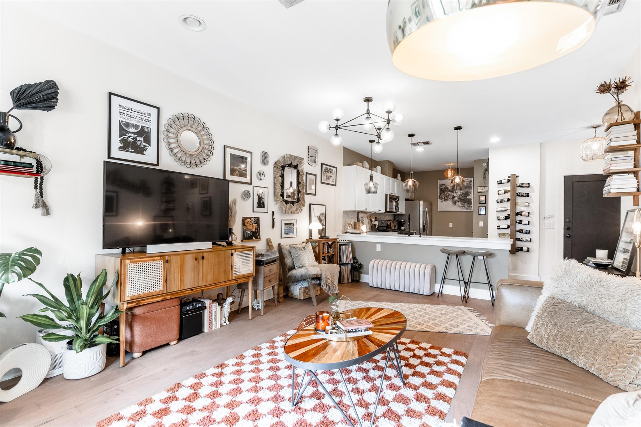 This spacious 1-bedroom, 1-bathroom corner unit home features a thoughtfully designed layout that balances comfort and functionality. The open-concept living space is filled with natural light, complemented by hardwood floors and custom lighting. The kitchen is both stylish, spacious, and practical, complete with a custom contemporary backsplash, pantry, and laundry closet.